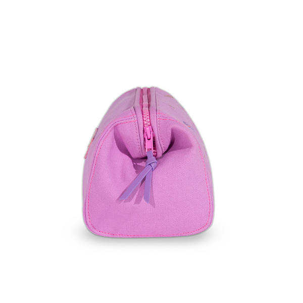 The Intergalactic Makeup Bag is embroidered with a  mushroom inhabited galaxy, on pinky-purple coloured cotton canvas, with pink coloured lining. The exterior and interior fabric is waterproof. There is a wireframe around the zipper opening of the bag, which enables the bag to remain open while in use.