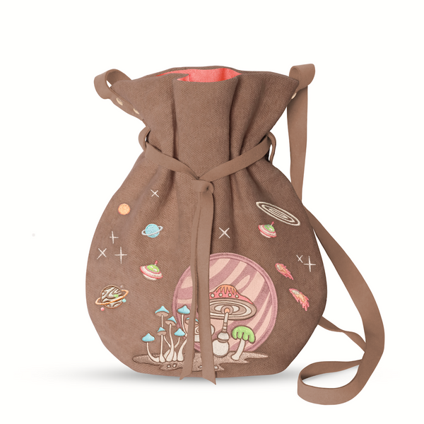 The Mycoverse Pouch is embroidered with a mushroom inhabited galaxy on milky-brown canvas, with bright coral coloured lining. The suedelike strap is vegan.