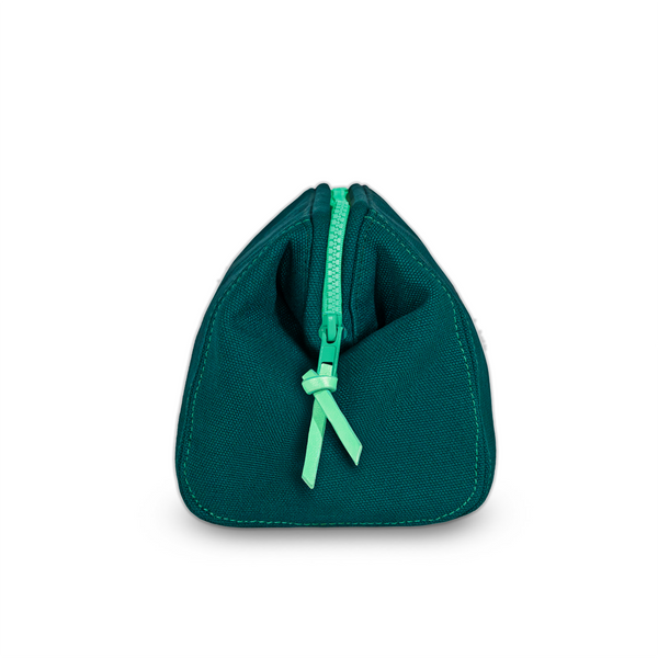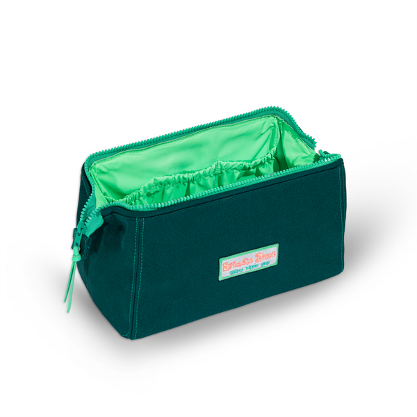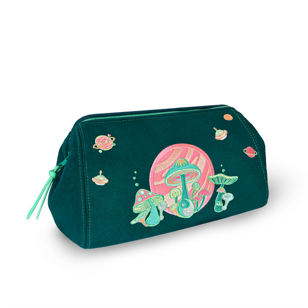 The Psilocyber Makeup Bag is embroidered with a  mushroom inhabited galaxy, on dark teal-green coloured cotton canvas, with mint coloured lining. The exterior and interior fabric is waterproof. There is a wireframe around the zipper opening of the bag, which enables the bag to remain open while in use.